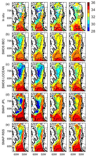 The various products used here are available for different time periods. The in situ and various satellite-derived data are available simultaneously for only a few years (spring 2015 to 2019), which would result in too few observations for robust estimates of the seasonal evolution of surface salinity. This is especially true for in situ observations, which are particularly sparse in high latitudes [10]. Thus, when computing averages (e.g., Figure 1) or estimating the seasonal evolution of fields (e.g., Figure 2), we used the entire time series available for each product. Using the longest possible time series for each product presumably yields a better estimate of seasonal variability in each case, although that also means that some of the differences observed between the various products may be related to interannual variability (e.g., anomalous conditions during a given year may be included in one product but not in others).