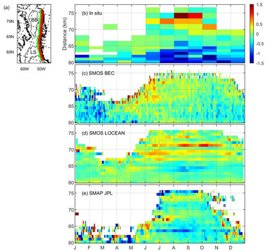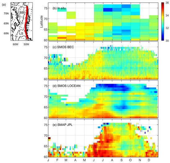 (a) Study area. BB: Baffin Bay; LS: Labrador Sea. Hovmöller diagram (month vs. latitude) of surface salinity averaged within 60 km from the west Greenland coast (area shown in red in panel) (a) based on (b) in situ data, (c) SMOS BEC, (d) SMOS LOCEAN, and (e) SMAP JPL.