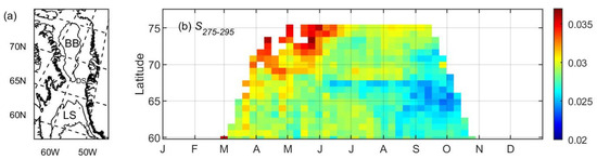 (a) Study area. BB: Baffin Bay; LS: Labrador Sea; DS: Davis Strait. (b) Hovmöller diagram (month vs. latitude) of CDOM spectral slope coefficient S275–295 (nm−1) averaged within 60 km from the west Greenland coast based on MODIS observations.