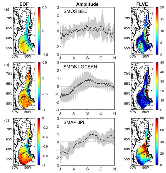 Empirical orthogonal function (EOF) decomposition of surface salinity observations from (a) (top panels) SMOS BEC; (b) (middle panels) SMOS LOCEAN; (c) (bottom panels) SMAP JPL. (Left) spatial pattern; (middle) amplitude time series; (right) fraction of local variance explained (FLVE; %) are shown. Only observations from July to October were used in the analysis. For each product, the amplitude time series is displayed as the average (black line) for the multiple years, with the gray shaded area showing the standard deviation between the years. Note that color bars vary between the panels to reveal as much as possible of the spatial structure in each case.