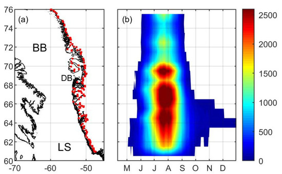 (a) Location of meltwater input from the Greenland Ice Sheet, shown by the red dots. BB: Baffin Bay; LS: Labrador Sea; DB: Disko Bay. (b) Climatological time series of meltwater input from the Greenland Ice Sheet (m3 s−1), integrated into 1° latitudinal bins.