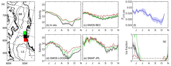 Climatological averages of surface salinity from the various satellite products are also shown in Figure 7c–e, which reveal differences among the products. Salinity in June, before the summer freshening occurs, is approximately 1 psu higher in SMAP JPL observations than in the other products, for example. Despite these differences, coastal salinity in the central area (black lines) decreases progressively for all products reaching a minimum in late August/early September, which is consistent with the in situ observations (Figure 7b). That is also consistent with the seasonal evolution of S275–295 (Figure 7f), which remains approximately constant during June but then progressively decreases from July to September indicating an increase in the terrigenous signature during that time. Comparing the magnitude of the summer freshening among the various satellite products and the in situ data indicates that it is lower in SMOS BEC at ~1.2 psu. For SMOS LOCEAN and SMAP JPL, freshening of 2.9 and 2.5, respectively, are observed in the central region, which is comparable to the magnitude observed with the in situ data. Interestingly, the summer freshening in the southern area (red lines) is lower in all satellite products compared to the central and northern areas. Given that the mean flow off southwest Greenland is to the northwest due to the presence of the West Greenland Current [87,88], this could be related to an input of meltwater at the central region at 64–65°N (Figure 6), which is then transported northward by the large-scale circulation. As a result, the summer freshening in the southern region (i.e., in the red box to the south of 64°N, upstream of the location of large meltwater input) is reduced. We note that this is not observed in the in situ data, however. Although this could indicate that the reduced freshening observed in the southern area (red lines) in the satellite data is an artifact, this difference could also be related to the sparsity of the in situ observations (i.e., the in situ data are not synoptic and represent averages of different locations in different years; thus, it is possible that synoptic events such as the transport of meltwater plumes by the mean northward flow could be missed). Despite the differences among the satellite products and the fact that in some cases biases in excess of 1 psu can be observed in the climatological averages, this analysis suggests that the various satellite-derived salinity products can capture the influence of meltwater input off southwest Greenland, although to different degrees. Note that the ice fraction in these coastal regions is virtually zero from July to September when the largest freshening is observed, although it begins to increase reaching 0.1% in October (Figure 7g).