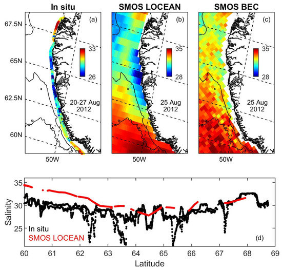 Surface salinity off west Greenland in late August 2012 based on (a) in situ thermosalinograph data, (b) SMOS LOCEAN, and (c) SMOS BEC. Note that satellite salinities (panels (b) and (c)) are generally 2–3 psu higher than in situ salinity (a), and, as such, the color bar in (a) is different than in (b,c) to reveal as much as possible of the spatial structure in each case. (d) Salinity from in situ data (black) and SMOS LOCEAN interpolated into the ship transect (red) are also shown as a function of latitude. SMOS BEC is not shown in (d) because of the wider coastal gap in that data set.