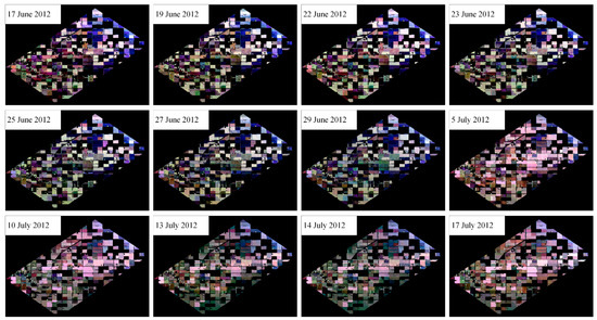 The data used in this study were the UAVSAR images obtained during the Soil Moisture Active Passive Validation Experiment 2012 (SMAPVEX2012). The SMAPVEX12 campaign lasted 43 days (7 June–19 July 2012), and the soil moisture and vegetation conditions changed significantly during the time period. A total of 13 days of UAVSAR data were acquired by the end of the campaign []. Twelve UAVSAR images of the same flight line were used for crop mapping. The images were ground-range projected and multi-looked data (GRD) whose preprocessing procedures include radiometric calibration, geometric correction (WGS-84), and multi-look processing (15 pixels in range and 60 pixels in azimuth directions). These images were resampled from (pixels) to (pixels) to reduce the time spent in the experiment. The images are multi-looked; thus, any speckle-filtering process was not conducted on the images. A description of the data is provided in Table 1, and the corresponding Pauli RGB images are shown in Figure 2. The local incidence angles of the pixels in the images are shown in Figure 3, where the minimum value is 21.2° (near range) and the maximum value is 64.3° (far range). The local incidence angle is defined as the angle between the radar line-of-sight and the surface normal vector [,,]. The terrain of the study area can be characterized as flat; thus, the incidence angle and local incidence angle are assumed to be the same in this paper. The numbers of pixels for each crop type are presented in Table 2.