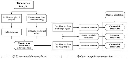 The constrained clustering methods using instance-level constraints were introduced to improve the reliability and stability of time-series clustering results. However, the effectiveness of pairwise constraints from the commonly used random sampling remains uncertain. Therefore, considering the characteristics of UAVSAR time-series images, a new method for generating informative pairwise constraints—namely, “active pairwise constraint learning (APCL),” is proposed. The flowchart of APCL is shown in Figure 4, which comprises the following two main steps: (1) extraction of the candidate sample set and (2) construction of the pairwise constraints.