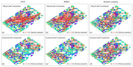 K-means was used as the unconstrained clustering algorithm and the ED as the similarity measure for the active constraint learning to visualize the distribution of the constraints constructed by the proposed method (APCL). The constraints of another two constraint learning methods were used for comparison. The first method was random sampling based on regions of incidence angle (denoted by RSRIA), which randomly generates CLCs within the same incidence angle region and generates MLCs between different incidence angle regions. The second method is the commonly used random sampling. The number of each kind of pairwise constraint was set to 200 for both constraint learning methods. The distributions of the obtained constraints are shown in Figure 6. Compared with the constraints of random sampling, the constraints of the proposed method link the samples with low silhouette coefficients, and all these samples are from either the near or the far range.
