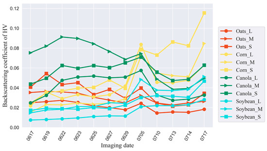 Previous works [,,] have proven that among the polarization channels of HH, HV, and VV, the HV polarization is the most effective channel for discriminating different types of crops in the crop mapping of polarimetric SAR time-series images because the HV is remarkably sensitive to the volume scattering, which supports the value of structural features in distinguishing across crop types []. Therefore, only the backscattering coefficient of HV polarization () was used for the crop mapping experiments in this paper; that is, the time-series curve for each sample was constructed using the corresponding values in all 12 images (i.e., ). In addition, using only rather than all the polarimetric features can simplify the analysis of the characteristics of time-series curves and provide guidance for crop mapping using single and dual-polarization data.