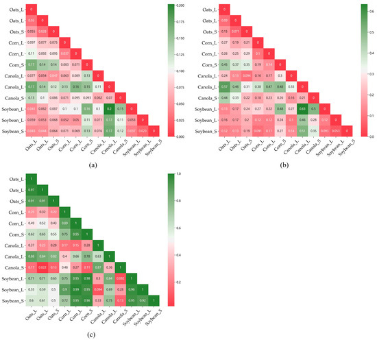 These findings show that the similarities between some curves of different crops are relatively high. Therefore, many crop samples will be easily misclassified in the time-series clustering. For instance, in Figure 8a, the ED between Oats_L and Oats_S is larger than that between Oats_L and Soybean_L and Soybean_S. Thus, when using the ED as the similarity metric in time-series clustering, the samples of oats in Inc_L are likely to be clustered into one group with the soybean samples. The ED between the soybean samples and their time-series curves is relatively small, indicating that they are less likely to be misclassified in the process of time-series clustering. Figure 8c shows that the similarities between corn and soybean are relatively high, indicating that the samples of these crops would be easily misclassified when using Pearson correlation coefficient as the similarity metric.