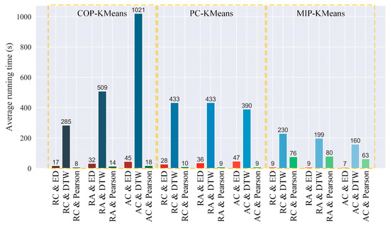 No obvious correlation exists between the running time of the clustering algorithms and the number of constraints in the above experiments. Therefore, the average running time of each algorithm was calculated under all numbers of constraints, as shown in Figure 10.