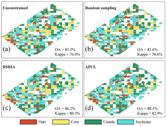 Crop classification maps with the highest accuracy for each method: (a) unconstrained clustering; (b) random sampling; (c) RSRIA; (d) APCL.