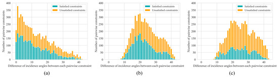 Numbers of satisfied and unsatisfied must-link constraints under the absolute values of the incidence angle differences: (a) random sampling; (b) RSRIA; (c) APCL.