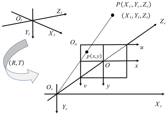 In Figure 1, the point P can be expressed in the camera coordinate system as , and its coordinates in the pixel system are expressed a . According to the camera imaging principle, the relationship of these three-dimensional coordinates can be expressed as