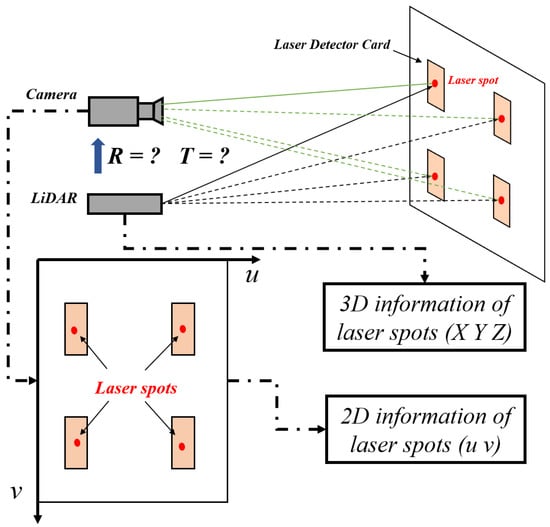 Since the camera can capture the position of the laser spot on the laser detector card, this paper uses the laser detector card as an auxiliary tool to directly obtain the correspondences between laser points and image pixels to complete the calibration of the LiDAR–camera system. As shown in Figure 2, when the laser emitted by LiDAR is pointed at the laser detector card, a laser spot is generated that can be directly observed by the camera. Now, for each laser spot on the laser detector card, the 3D information acquired by LiDAR is in Equation (3), and the image coordinate information acquired by the camera is in Equation (3).