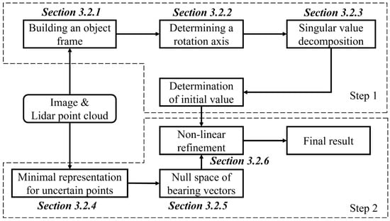 We use the values of , obtained in Section 3.2.3 as the initial values of u. Furthermore, is expressed as the Cayley parameter to obtain a minimal representation of the rotation matrix in this paper. Next, the Gauss–Newton method is used to solve the above problem, using only one iteration, since the initial value , is sufficiently accurate.