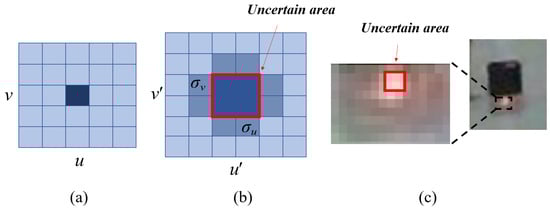 If a laser spot occupies only one pixel (as shown in Figure 5a), then the pixel information at this point is determined. However, in the actual system, due to the interference of astigmatism and stray light, the light spot may occupy several pixels (as shown in Figure 5b,c).At this time, there is an error between the pixel information of the laser spot extracted by the classical centroid extraction method (equation) and the actual pixel information of the laser spot. Because it is difficult to determine the true error, we compare the calculated gray value of the laser spot with the gray value of its neighborhood to determine the uncertain area of the laser spot, and finally obtain the uncertain representation of the pixel information of the laser spot: