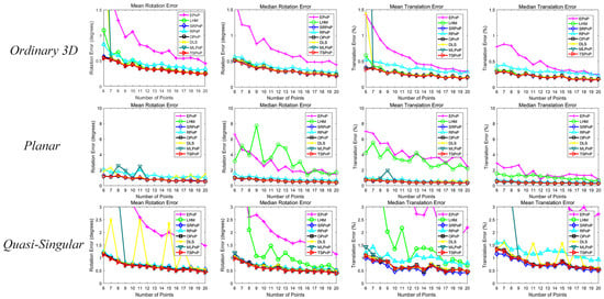 We first design simulation experiments to evaluate the performance of all methods with different number of points. The number of points is gradually increased from 6 to 20 and zero-mean Gaussian noise with a fixed deviation = 2 pixels is added to the image. From the results in Figure 7, it can be seen that EPnP (and, in general, EPnP+GN) is not accurate enough due to its potential linearization scheme, especially when n is very small. RPnP performs poorly in many cases because it is not an optimal calculation method. In the quasi-singular and planar cases, the accuracy of the LHM is much lower. In addition, when the number of points is relatively small, the results of LHM may be wrong because there may be a local optimum. Due to the singularity of the Cayley parameters, the DLS method is unstable for the proposed singular and planar cases. MLPnP is equally unstable for the proposed singular and planar cases. Compared to the most advanced and available methods, the accuracy of TSPnP, OPnP and SRPnP are comparable; in the quasi-singular case, the rotation matrix of TSPnP is slightly better than that of the OPnP and SRPnP methods.