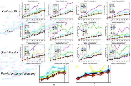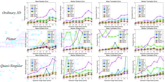 The third simulation experiment similarly tested the effect of noise on the accuracy of all methods, keeping the number of points constant (n = 10) and increasing the noise bias level from 0.5 pixels to 5 pixels. However, for the noise deviation level , a number from 0 to was chosen randomly for each point as the Gaussian distribution variance. That is, the Gaussian distribution variance of all pixel points was not the same, but the variance of the Gaussian distribution of each pixel point was distributed uniformly from 0 to . This can be seen from the results in Figure 9, TSPnP and MLPnP were exceptional in these cases, and in terms of accuracy, TSPnP and MLPnP were still far better than other methods. In addition, TSPnP was more stable than MLPnP in the planar case and quasi-singular case.