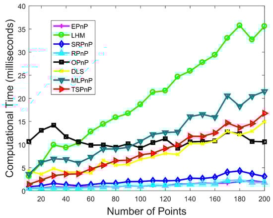 The proposed TSPnP method only needs one iteration; therefore, it has an advantage over the iterative algorithm in terms of computational efficiency. For this reason, this paper conducted experiments to compare the calculation times of the algorithms, as shown in Figure 10. The reference number of points n was varied from 10 to 1000, again adding Gaussian noise with zero mean and standard deviation of d = 2 pixels, and the experiment was repeated 500 times independently. Figure 10 represents the average computation time for these 500 experiments. It can be seen from Figure 10 that although the efficiency of our proposed algorithm execution decreases as the number of estimation points increases, the estimation accuracy becomes higher. Compared with other methods, our algorithm executes more efficiently than the iterative algorithms LHM and MLPnP and the non-iterative algorithm OPnP when the number of points is below 130. While the execution efficiency is lower than EPnP, RPnP, SRPnP and OPnP when the number of points exceeds 130, our algorithm is more robust and can consistently obtain high accuracy results with various noises. Moreover, since the method proposed in this paper uses only four reference points and almost reaches the fastest speed of existing algorithms when the number of points is small, the proposed method is efficient.