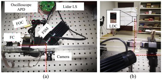 In the experiment, we used a 1550 nm LiDAR based on fast mirror scanning and a common visible light camera with a resolution of 1280 × 720. Specifically, a real LiDAR camera system (as shown in Figure 11a) was built to evaluate the practical application of our proposed method. The LiDAR light source (LiDAR LS) enters from Port 1 of the fiber optic circulator (FOC), exits from Port 2 of FOC, and finally is emitted into free space through the fiber-collimator (FC). When the laser is emitted from the fiber collimator into free space, a reflection occurs, at which time the reflected light enters through the fiber from FOC Port 2, and the laser that enters from FOC Port 2 is output from FOC Port 3. The light output from FOC Port 3 is connected to the APD detector to generate an electrical signal, at which point the electrical signal is collected with an oscilloscope and the emission time of the laser is recorded. The laser in free space is deflected by the fast-steering mirror (FSM); when the deflected laser light hits the surface of the object, part of the laser will re-enter the FC after reflection, and the laser that re-enters the collimator will likewise enter the APD detector through the FOC, at which point the time is recorded by the oscilloscope. The three-dimensional information of the laser point irradiated on the object can be obtained from the time , and the angular information of the FSM.