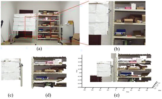 Fusion of LiDAR data and image data. (a) Experiment scene. (b) Area scanned by LiDAR. (c) Colorized point cloud of whiteboard. (d) Colorized point cloud of goods shelves. (e) Colorized point cloud in scene.