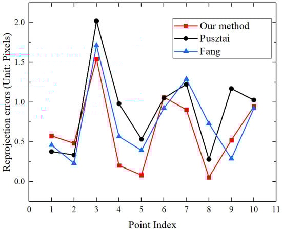 The performance of different calibration methods for LiDAR–camera systems was studied in this experiment. We compared our method with that of Pusztai et al. [] and Fang et al. []. Pusztai used a simple cardboard box with a known size as an auxiliary calibration object, and then extracted corner features to obtain 3D–2D point correspondence, thereby obtaining the external parameters of the LiDAR–camera system. Fang used panoramic infrastructure and a circular mark rather than the apriltag mark as the calibration object, and obtained the 3D–2D point correspondence by extracting the center of the circle and the environmental structural features, thereby obtaining the external parameters of multiple cameras and LiDAR. Our method used the laser detector card as the auxiliary object. With the 3D information of the laser spots obtained by LiDAR, the camera can directly capture the laser spots in the laser sensitive area to obtain the corresponding 2D information, thereby obtaining the external parameters of the LiDAR–camera system. The re-projection error of these methods is shown in Figure 14. It was found that the re-projection error of our method is smaller than that of the other two methods; this is because the other methods all need to extract features from the data to indirectly complete the calibration, and Pusztai’s method requires additional internal parameters known in advance. The average re-projection errors of our method and the other two methods were 0.64 pixels, 0.90 pixels and 0.75 pixels, respectively, Therefore, our method using direct 3D–2D correspondences can achieve more accurate calibration results.