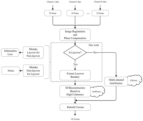 Layover is the biggest challenge to interpretations in 3D SAR imaging, and the detection of layover becomes the cornerstone of the processing of 3D SAR images. With the rapid development of technology and demand in recent years, array SAR is of significant interest in airborne reconnaissance, forest inventory, and subsurface or wall-penetrating sensing applications [1]. Essentially, 3D SAR imaging by multi-channel data is an inverse problem of radar imaging [2,3]. Meanwhile the layover areas are the most critical portion to inverse in the 3D SAR image, which usually contain dramatic changes in terrain and abundant elevation information [4,5,6]. Thus, the detection of layover has emerged as a significant issue in the processing of reconstruction. Figure 1 illustrates the location of layover detection in the whole procedure. As shown in the flowchart, after image registration and phase compensation, layover detection is adopted to determine which method should be applied for the sake of efficiency and accuracy. The super-resolution operation used in layover areas consumes hundreds of thousands of times more computing resources than interference processing, which is suitable for non-layover areas. The overall interpretation process can be made more efficient by applying the correct method to each corresponding area. Both efficiency and accuracy are significantly impacted by the layover detection. Once layover is mistaken for non-layover, meaningful information will be discarded. Moreover, there will be massive noises if non-layover is mistaken for layover. Thus, layover detection has a substantial impact on 3D SAR imaging.