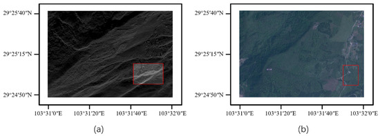 The proposed method aims to detect layover caused by sloping topography such as mountains, and its validity has been verified on the simulation test set. Then, it is further validated on the actual mountain area data. The actual SAR data used for model testing came from the hilly regions in the Shawan District ( to E, to N), which lies southwest of Leshan City in China’s Sichuan Province. This area is located in the transition zone between the Daliang Mountains and Sichuan Basin. It is dominated by mountainous terrain, with complicated topography and numerous vegetation. Thus, it is difficult to analyze topographic changes from optical images. Additionally, there are abundant woodland and mineral resources. Therefore, it has practical significance to use this region as the actual dataset to verify our method. Figure 10 shows a SAR image and an optical image of this area.