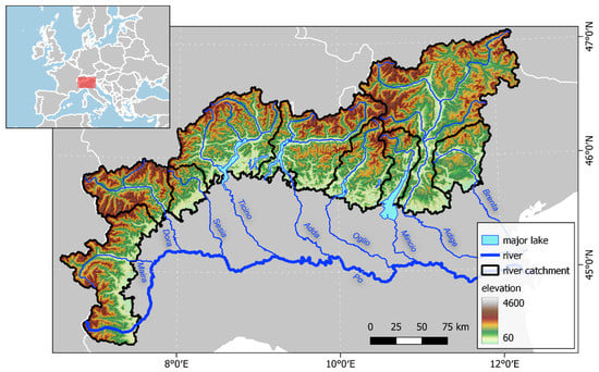 In the summer of 2022, Northern Italy was suffering an exceptional hydrological drought that particularly affected the basin of Italy’s largest river, the Po. A discharge deficit of 66% (264 m3/s instead of the expected 819 m3/s) has been reported at the station in Piacenza for the month of March 2022, and even higher deficits of around 75% have been observed in the Po’s Alpine tributaries Dora Baltea, Adda, and Ticino [1,2]. By July 2022, official drought emergencies and water restrictions had been issued in five Italian regions, affecting 42% of the Italian population [3]. The lack of available fresh water had impacts on Italy’s agricultural sector, negatively affecting plant productivity and irrigation potential. The Soil Moisture Index was below −2.0 in many areas, indicating extreme drought. At the same time, salt water intrusion in the Po river delta was at an all-time high [1,4,5,6]. Meanwhile, hydroelectric reservoirs in Northern Italy were 34.8% below the 8-year minimum energy potential experienced in 2021 [4]. This shortage of fresh water was the result of an exceptionally dry and mild winter 2021/22. Compared to the average of 1991–2020, the temperature was 2.1 °C higher, while at the same time, precipitation was 65% lower. Between December 2021 and February 2022, only 25% of the expected precipitation was recorded [1]. The situation was exacerbated by multiple heat waves at the end of May, the middle of June, and July, due to the persistence of one of the most extreme geopotential height anomalies over Europe since 1950 [4,7], which potentially further increased runoff deficits through evaporation enhancement [8].