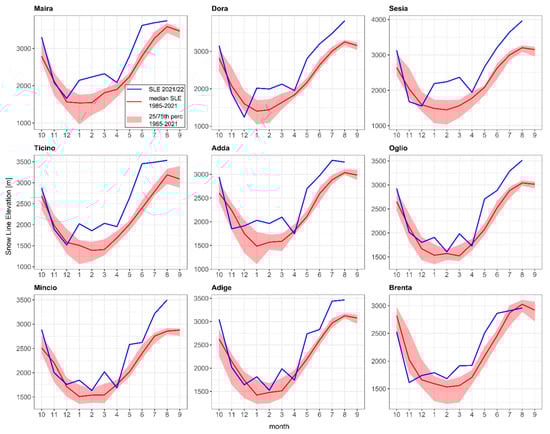 SLE of the hydrological year 2021/22 (blue line) in comparison to the median (red line) and 25th and 75th percentiles (red area) between 1985 and 2021 for nine Italian catchments.