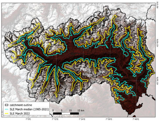 This SLE deviation from the long-term median results in a deficit of snow-cover area, as illustrated for the example of Dora Baltea in March 2022 (Figure 3). Here, the snow-covered area is visible in the underlying false-color satellite image from 26 March 2022. In this case, the SLE is averaged over three satellite observations acquired in the same month. Although over- and underestimations of the SLE occur locally, mainly due to different aspects and slopes of the terrain, the approach models the actual snow-cover outline quite accurately across the entire catchment. The lack of snow-cover area is clearly visible between the lines of the 2022 SLE and the long-term median.