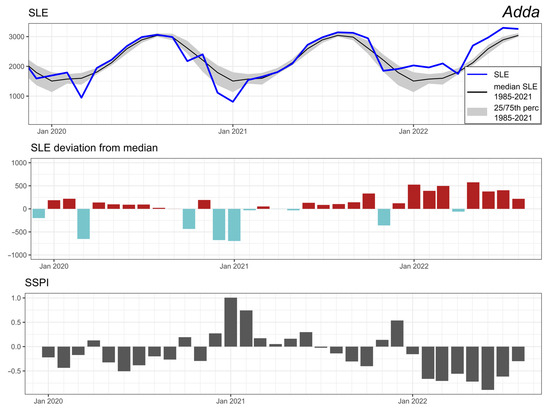 Nonetheless, in the case of Northern Italy in 2022, the SLE clearly exhibited the patterns expected to precede a hydrological drought. Its dynamics in January, February, and June 2022 reflected the reported mild temperatures and the lack of precipitation [1,4]. To verify this observation, we compared the recent SLE dynamics with the monthly averaged Standardized Snowpack Index (SSPI) between January 2020 and August 2022 in each catchment. The SSPI is a dimensionless metric of the SWE standardized over a 40 year reference period (1981–2020) [39]. Positive values indicate that more snow than usual is present, while negative values represent a lack of snow compared to the reference period. The SSPI data were provided by the Alpine Drought Observatory (ADO) dataset (https://ado.eurac.edu/ (accessed on 6 October 2022)). The SWE data used as input for the calculation of the SSPI are derived by using a modified version of the deterministic snow model SNOWGRID-CL [40] driven by downscaled ERA5 data (1979 to today) provided by the Copernicus Climate Change Service. For each catchment, we used the spatial median of the 30-day aggregated variant of the SSPI. Note that, as modelled values, these data cannot be considered ground truth and are affected by the issues discussed above. In the context of this discussion, however, the comparison of SLE dynamics with an established and evaluated SWE dataset can give some indication toward a potential linkage between snow cover and runoff.