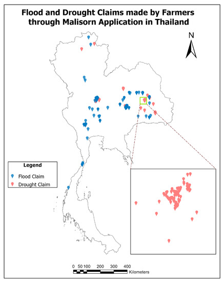 Depending on the farmer’s claim, the study area is distributed all over Thailand. Specifically, the experiments are carried out on the polygon of land plots provided by farmers during their insurance claims. The experiments are irrespective of disaster/non-disaster declared areas to facilitate all farmers in Thailand. Figure 1 illustrates locations of flood and drought claims made by the farmers using the Malisorn application of their respective farms. Moreover, the different regions provide various practical challenges and limitations due to satellite image properties that improve the scalability and robustness of the designed method.