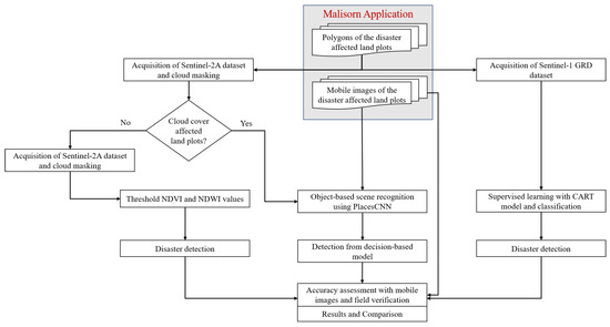 This research investigates several approaches to automate verifying farmers’ claims of their loss from flood and drought disasters. Three remote sensing methods and one mobile sensing method are investigated along with their combinations to solve the prominent problems of remote sensing. The four diverse methods include NDVI and NDWI on Sentinel-2A images, CART classification on Sentinel-1 SAR GRD images and PlacesCNN on mobile photos. The methods of NDVI and NDWI on optical images of Sentinel-2A is highly disturbed by the effects of cloud and their shadows. A combination of remote-sensing and mobile-sensing methods of NDVI+PlaceCNN and NDWI+PlacesCNN overcomes the problem of clouds. NDVI+PlaceCNN and NDWI+PlacesCNN achieve up to 86.21% and 83.79% accuracy in flood detection and 73.40% and 81.91% in drought detection. Unlike the optical sensors of Sentinel-2A, Sentinel-1 SAR images are unaffected by the clouds because of their longer wavelengths. CART classification on the SAR achieves an accuracy of 98.77% and 99.44% for flood and drought detection, respectively. In addition to detecting flood and drought, the area proportion of the affected lands could also be measured from the remote-sensing data. The experiments show similar observations in measuring the area proportions using the three remote-sensing methods. The experiments demonstrate the superiority of the CART method on SAR in terms of accuracy, data acquisition, cloud disturbance and measuring the area proportion of the affected land. Despite the performance, the reliability of the SAR-based method is still affected by the unavailability of data. In the case where the remote-sensing data are disturbed by clouds or unavailable, the mobile-sensing method provides the best alternative to verify and validate the claims while trading off the measurement of the area affected by the disasters.