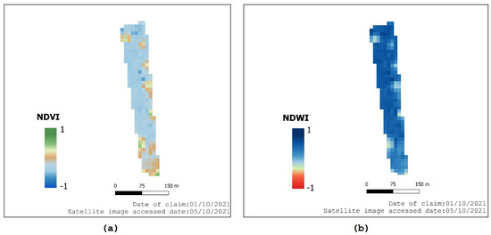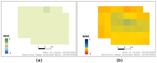 A sample plot with (a) NDVI and (b) NDWI calculation to detect drought in each pixel obtained from a Sentinel-2A image.