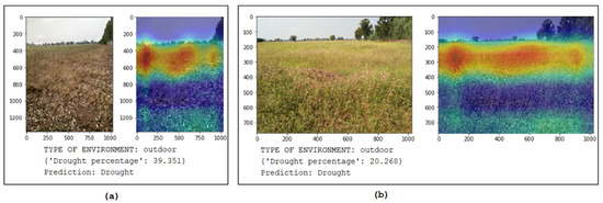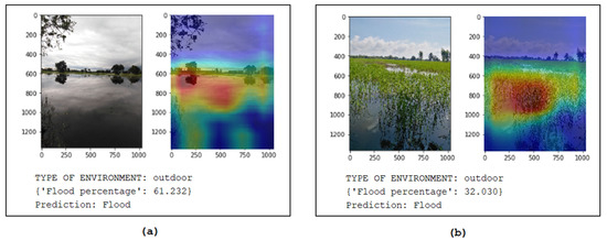Samples of mobile photos, activation maps and predictions made from our decision-based method for flood detection. The heat map shown is an activation map used by the final layer of ResNet-18 of PlacesCNN to make its prediction. (a) Sample from the severely flooded region. (b) Sample from the moderately flooded region.