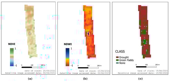 The process of drought detection is the same as flood detection. In a total of 199 verified drought-affected claims by farmers, only 49 are unaffected by cloud cover. Figure 7 presents a sample land plot to detect drought using NDVI and NDWI methods. Table 6 shows the accuracy of NDVI and NDWI on the land plots unaffected by clouds and their shadows. The experiments show 100% accuracy from NDWI and 89.89% accuracy from NDVI.
