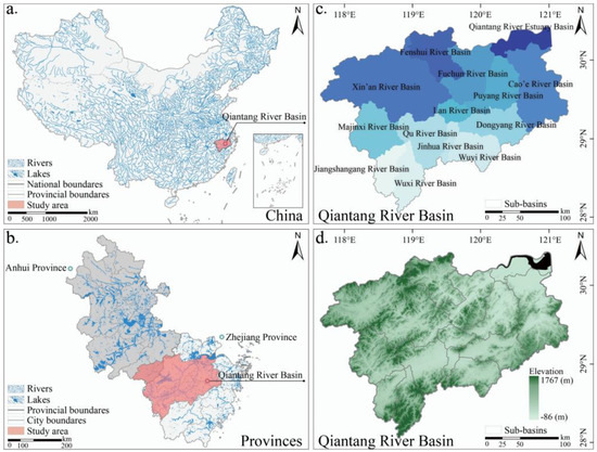 Basic information of the study area: (a,b) are the locations of the study area in China and provincial scale; (c) is the boundary of 14 sub-basins; and (d) is the digital elevation model (DEM) of the study area.