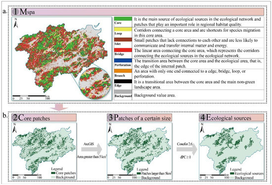Process of ecological source selection: MSPA (a) and connectivity analysis (b).