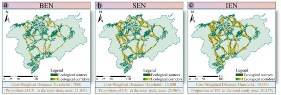 Only when the corridor has a certain width or extent can it be used as an ecological constraint. Therefore, in circuit theory, we identify the corridor range according to the threshold value of the accumulated resistance [38]. Taking into account the corridor width requirements for biological flow [4,67] and the proportion of EN area in the study area [68], we extracted the ecological corridors when the cumulative resistance was 5000, 11,000, and 19,000 to construct the bottom-line EN (BEN), satisfactory EN (SEN) and ideal EN (IEN) (Figure 5).