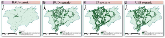 Considering the protection of large-scale waters and nature reserves, this study set them as restricted conversion areas in all scenarios. The ecologically restricted areas in each scenario are shown in Figure 6. In addition, considering that urban construction land is difficult to convert into other land, and this type of conversion is excluded [24].