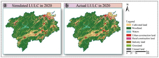 Comparison of simulated (a) and actual LULC (b) in 2020.