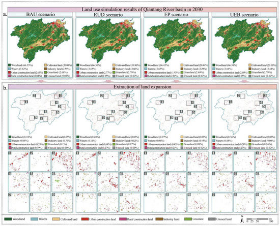 The EN-PLUS model was used to simulate the land use of the Qiantang River Basin in 2030, and the results are shown in Figure 8a. As shown in Table 3, compared with 2020, there are obvious differences in the degree of land use change in each scenario. The most obvious changes are in urban construction land and industrial land. The average annual growth rates of urban construction land were 2.34% (BAU scenario), 2.83% (RUD scenario), 1.87% (EP scenario), and 2.18% (UEB scenario). Industrial land shows the same trend as urban construction land. However, rural construction land experiences the fastest growth under the BAU scenario, which is different from the result obtained using the Markov chain, which calculated that its growth was the fastest under the RUD scenario. Although we tried to make the simulation results match the preset scenario by adjusting the patch generation threshold and expansion coefficient by referring to the method of Liu, Liu, Wang, and Liu [41], this did not work. This may be due to the PLUS model introducing the analysis of competition within patches, which resulted in the expansion ability of rural construction land being weakened by other landscape types under the RUD scenario, so its amount was less than the preset value, but the deviation was <5%. The simulation mechanism of the PLUS model makes the simulation results more in line with the actual situation [52].
