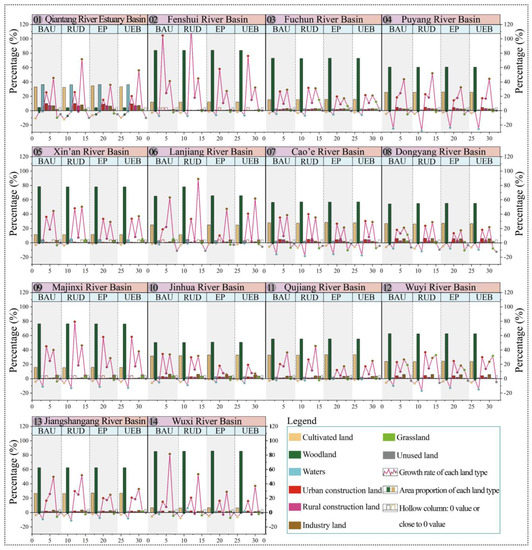 From the perspective of the role of ecological constraints, the growth rate of construction land in 11 subbasins was RUD > BAU > UEB > EP. However, in the Cao’e River, Jinhua River, and Wuxi River subbasins, the highest growth rate of construction land was under the BAU scenario, which is mainly due to the higher growth rate of rural construction land in this scenario. Compared with the RUD scenario, the growth rate of construction land under the EP scenario dropped by an average of 13.61%. In addition, focusing the analysis on the growth rate of urban construction land, which has the greatest impact on the environment, the results show that there were 10 subbasins with the trend RUD > BAU > UEB > EP. However, in the Lanjiang River, Jiangshangang River, and Majinxi River subbasins, the trend was RUD > UEB > BAU > EP. The reason for this difference is in line with our analysis in Section 4.2.1. In conclusion, the EN-PLUS model, we constructed can effectively control the scale and degree of future LULCCs.