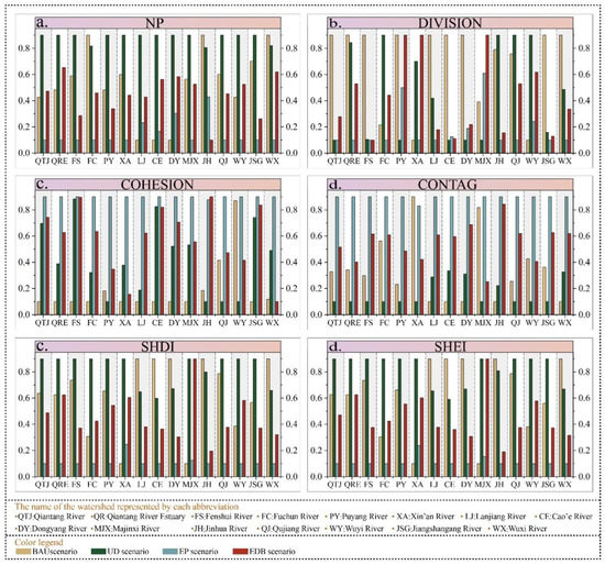 In terms of the landscape diversity index, the trend in the SHDI value in most regions was RUD > BAU > UEB > EP, which indicated that landscape heterogeneity was positively correlated with the degree of human disturbance. However, there are five subbasins with a maximum SHDI value under the BAU scenario, because the construction land in some subbasins (Cao’e River, Jinhua River, and Wuxi River subbasins) increases the most under this scenario. In addition, in the Lanjiang River and Dongyang River subbasins, this phenomenon may be caused by the disorderly development of the current construction land.