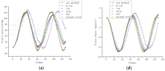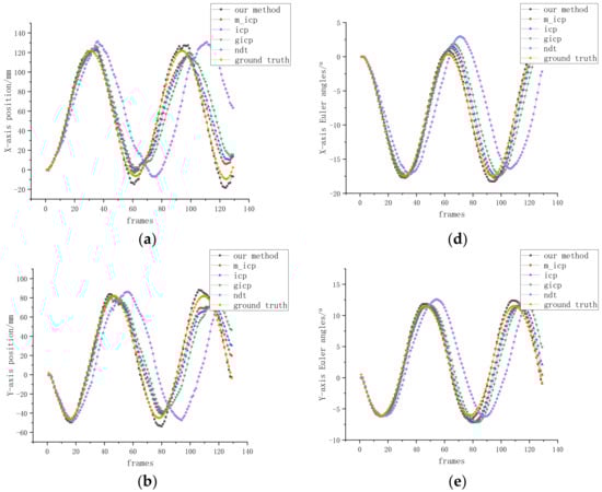 In this study, it was assumed that the rotation angles α, β, and γ around axis ZYX were denoted as roll, pitch, and yaw, respectively. In the experiments, we separately calculated the results of five methods (our method, m_icp (ICP modified in Section 2.3), original ICP, GICP, and NDT). The original ICP, GICP, and NDT inputs are all raw point clouds instead of filtered point clouds. The effectiveness and accuracy of our method could be determined by comparing these pose-estimation results with the ground truth.