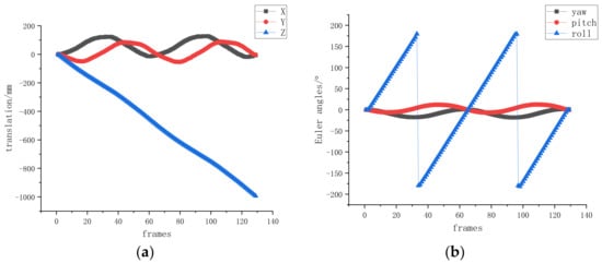 In the rotation experiment, we fixed the TOF camera and rotated the target model 720° clockwise around the manipulator flange. Suppose the initial position of the target model is set to (0, 0, 0) mm, and the initial Euler angle is (0, 0, 0)°. However, because the installation positions of the target model and the TOF camera were not precisely adjusted, the Z axis of the camera was not parallel to the flange axis of the manipulator; therefore, the Euler angles of the other two axes were estimated to be non-zero in the rotation experiment.