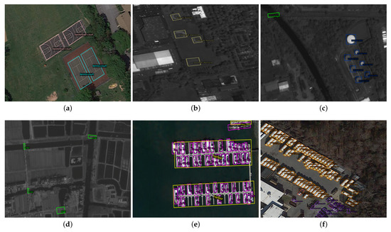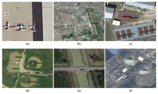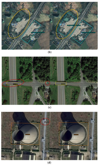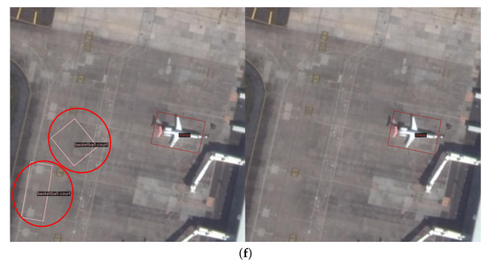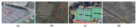 Object detection classifies and locates geospatial objects in aerial images and is a fundamental task in remote sensing. Recently, there have been great advances in object detection in aerial images (ODAI) [1,2] with the advent of deep convolutional neural networks. Because of this, applications in some fields, such as (UAVs) and wireless sensor networks (WSNs), have also benefited dramatically [3,4]. Although a large number of excellent methods [5,6,7,8,9] have been invented in the past few years, updating the previous state-of-the-art methods, there are still problems, such as missing detections and false detections caused by densely distributed objects, varied object sizes, and occluded objects. To illustrate, Figure 1a is a visualization of false harbor and helicopter detection, where a plane is detected as the harbor, and a piece of land is regarded as a helicopter. In Figure 1b, a piece of agricultural land is detected as a soccer ball field. In Figure 1c, a shaded basketball court is not detected. In the right of Figure 1d, two bridges are not detected, which damages the detection performance. The traditional object detection paradigm only takes the extracted feature into consideration. However, this is the bird eye view in aerial images. Therefore, detection algorithm inference only uses the roof information from aerial images. Moreover, due to its complex background features, such as the shape similarity and appearance similarity between objects and the background, the wrong labels are predicted. Because of the ambiguous appearance, those algorithms with an advantage in terms of extracting features do not have a significant effect. This is because when the instances are ambiguous, the extracted features are not that powerful, which leads to missed detection and false detection.