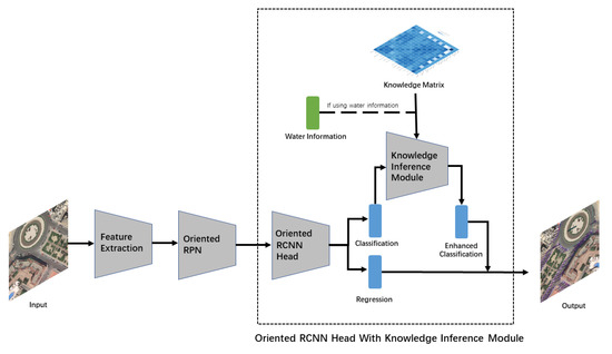 In this paper, we propose a knowledge-inferencing module that uses a residual structure to optimize the predicted class scores, which helps the detector to perform better. Our method can be applied to any two-stage object detection framework. In this work, we chose the Oriented R-CNN [15] as the framework and baseline model. The overall structure of the framework filled with the knowledge-aware bounding box head is presented in Figure 3.
