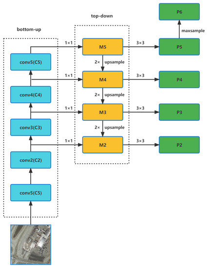 Resnet-50 [19] and FPN [34] are adopted into the Feature Extraction module to extract multi-scale features with which size-various objects can more easily be detected. Figure 4 shows the overall structure of the Feature Extraction module. In the bottom–up part, the input image is first input into a series of convolutional layers to generate low-semantic feature maps and high-semantic feature maps {, , , , }. Moreover, the top–down part obtains more powerful features by fusing features. To be specific, is equal to the sum of the result of the upsampling of and the result of the convolution of . In this way, and are generated. , , , and are obtained by feeding , , , and into a 3 × 3 convolutional layer, and is obtained by maxpooling . Finally, this module outputs the fused multi-scale features {, , , , and }.
