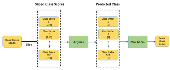 The structure of the Main-Class-Seeking module is illustrated in Figure 8. We first slice the tensor class scores into 512 small tensors and encode them into values of 1 to 512. Then, the sliced class scores are fed into the argmax() function outputting the classes with the highest classification scores. The function max check() is used to count the number of each category in the 512 predictions. This is performed sequentially, where the class with largest number is the main class.